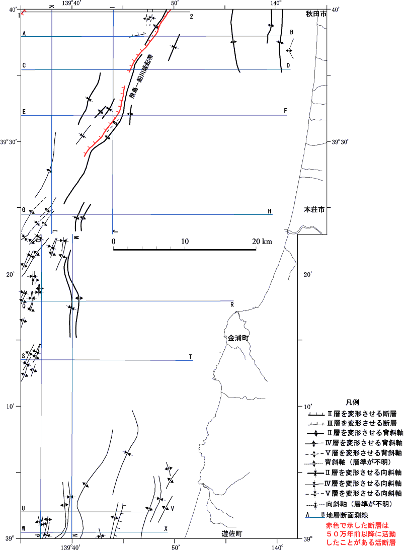 北部海域中央から北部海域南西端部へと連続する飛島−船川隆起帯に2条の活断層がみられました。