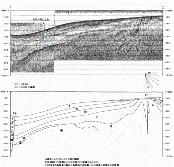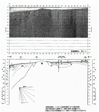 | 北部 記録位置は地質構造図中の1-2測線 | 南部 記録位置は地質構造図中のW-X測線 |