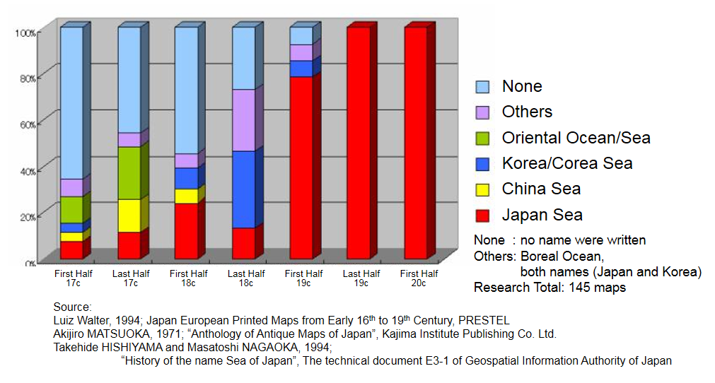 Hydrographic Authorities of the U.K. (since 1863), the U.S.A (since 1854), Russia and France (since each country’s Hydrographic Department began the publication of a nautical chart of the sea area around the Sea of Japan (Japan Sea)) have solely used the Sea of Japan (Japan Sea) in their nautical charts related to this sea area since their first edition.
